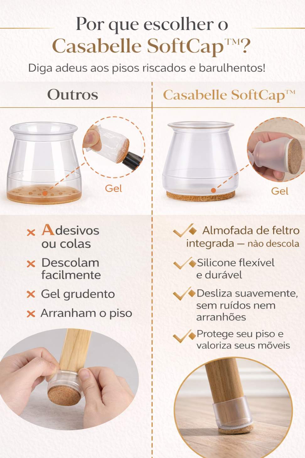 Chega de barulhos irritantes e riscos no seu piso! Com o Casabelle SoftCap, seus móveis deslizam suavemente sem causar danos e sua casa ganha mais conforto, silêncio e elegância.
