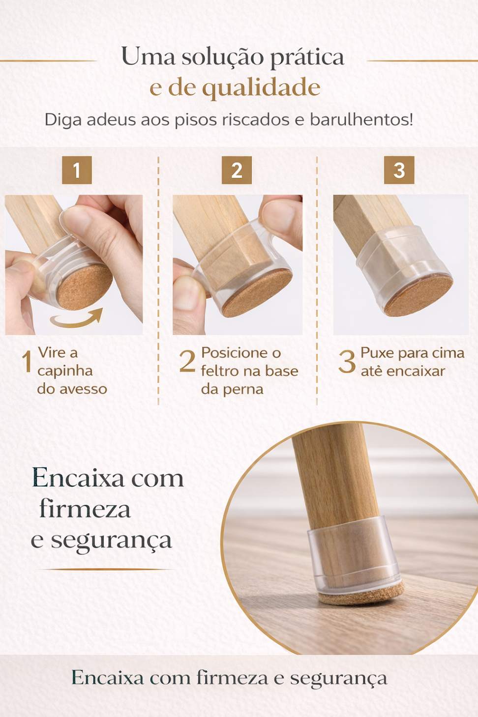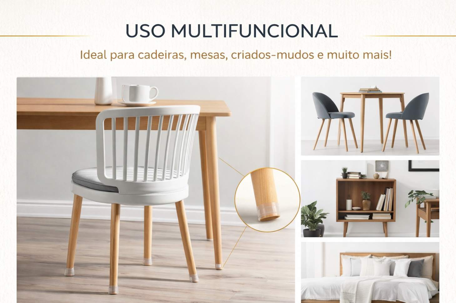 Fabricados em silicone premium de alta durabilidade, eles se ajustam perfeitamente às pernas das cadeiras e mesas, evitando arranhões, ruídos e marcas indesejadas no chão.