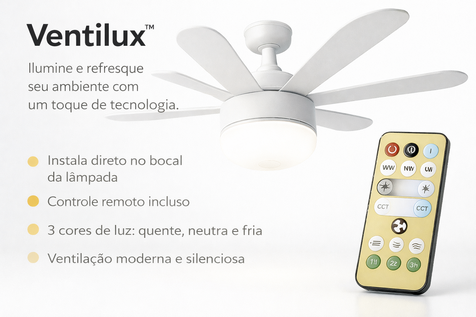 Transforme qualquer cômodo com o Ventilux, o ventilador de teto que se instala direto no bocal da lâmpada.